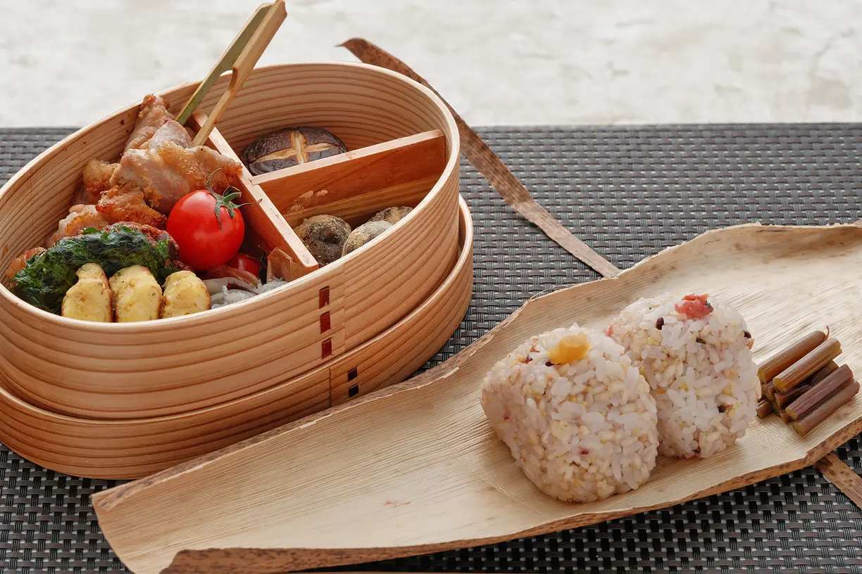 雑穀おにぎり(梅・味噌大根) / 鳥のひしお焼き / しいたけ手裏剣とカブの蘇(チーズ)のせホイル焼き / 納豆とわらびの大葉つつみ揚げ(梅風味) / うずらのフワフワ卵焼き / カブ菜とシラスのおひたし / 兵糧丸 / プチトマト