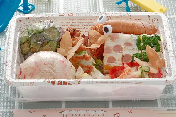 岩手県産豚挽肉の野菜たっぷりハンバーグ / 岩手県産白身魚のフライ / 岩手県産卵のひよこ飾り / 塩おにぎり / さくらでんぶの酢飯おにぎり / 波に見立てたキャロットラペ / ウィーン風ポテトピューレ / フジツボに見立てた岩手県産プチトマトのベーコン巻き / スライスハムのイソギンチャク仕立て / 岩手県産ブロッコリーのローリエ風味 / MIXビーンズサラダ(青大豆、ひよこ豆、赤インゲン豆、大豆)
